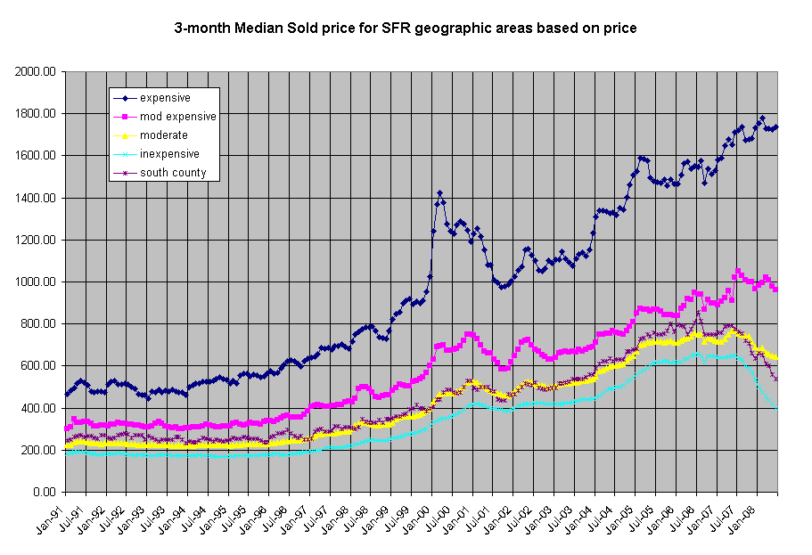 I received a monthly email update about the Bay Area real estate market and it had an interesting chart in it. It breaks out prices in the Bay Area by region from 1991 to the present, categorized by expensive, moderately expensive, etc. See below the chart for the full list of categories. You can right-click on the chart and click "view image" to make it larger, or click on the link at the bottom of this blog entry to go to the full overview.
