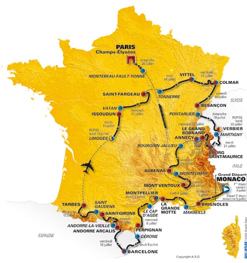 "After the so-called modest parcours of the previous edition, the 2009 Tour de France will be anything but. From the longer-than-usual 15km opening time trial around the streets of the millionaires' paradise of Monte Carlo, the final destination of the maillot jaune ought to be wide open right up to the final day thanks to a sting in the tail the like of which has not been seen in the Tour before. // The 2009 Tour parcours is also the most international for many years; starting as it does outside France in the Principality of Monaco, the route also passes through Spain, Andorra, Switzerland and Italy. Additionally, due to the southern position of the Grand Depart, the clockwise route will see the race tackle the Pyrenees first, just as the anti-clockwise route did last year." www.cyclingnews.com presents the 96th Tour de France