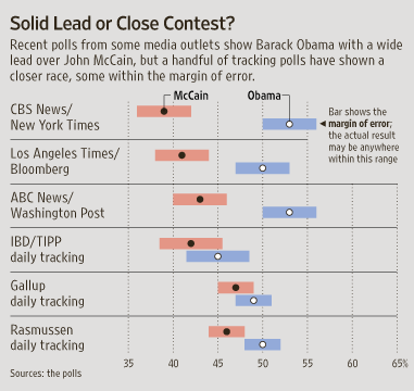 "A spate of widely publicized newspaper and network polls over the past week have shown Barack Obama opening a big lead over John McCain. But other surveys tell a somewhat different story, suggesting the presidential race is still close, and the Republican has even gained ground in recent days. The reason for the divergence: Pollsters are facing new challenges this year, trying to gauge whether the electorate is changing, and how much." Some Surveys Indicate Tighter Presidential Race