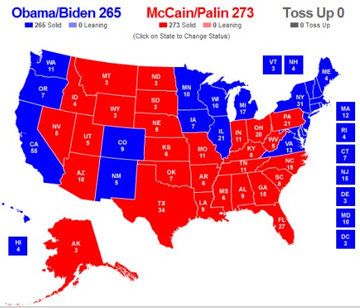 "I think John McCain will win a squeaker over Barack Obama, 273-265, by holding Florida, Nevada, and adding Pennsylvania as a trade for Virginia:" Hot Air -- Blog Archive -- My Predictions